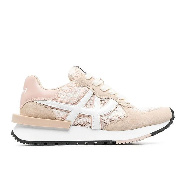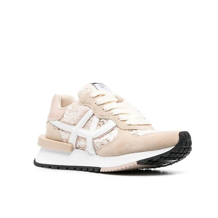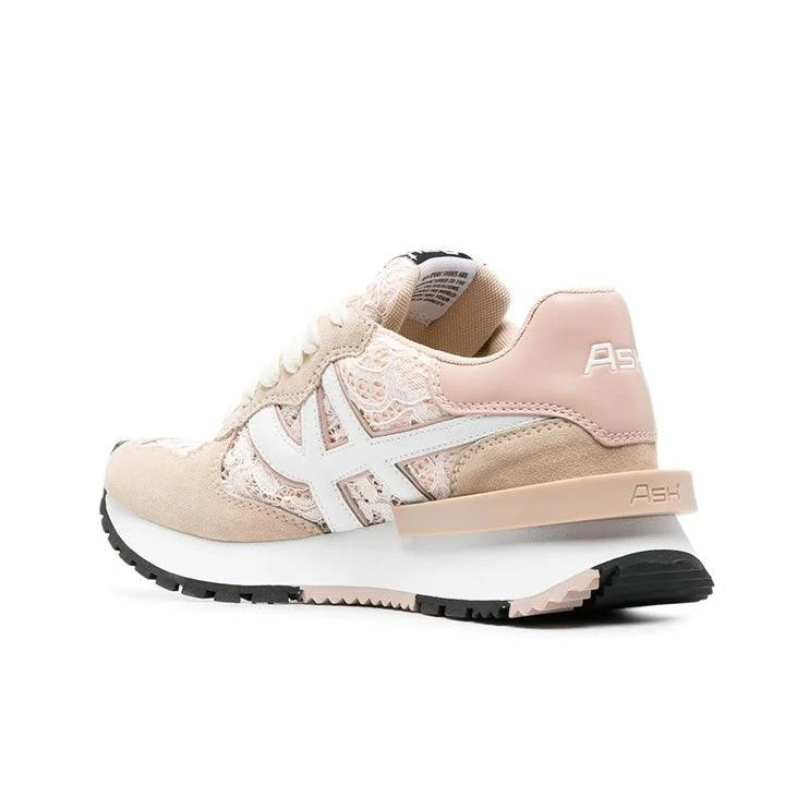 logo-embroidery trainers from ASH featuring light pink, white, calf suede, mesh panelling, all-over logo embroidery, debossed logo to the rear, logo patch at the tongue, front lace-up fastening, almond toe and rubber sole.