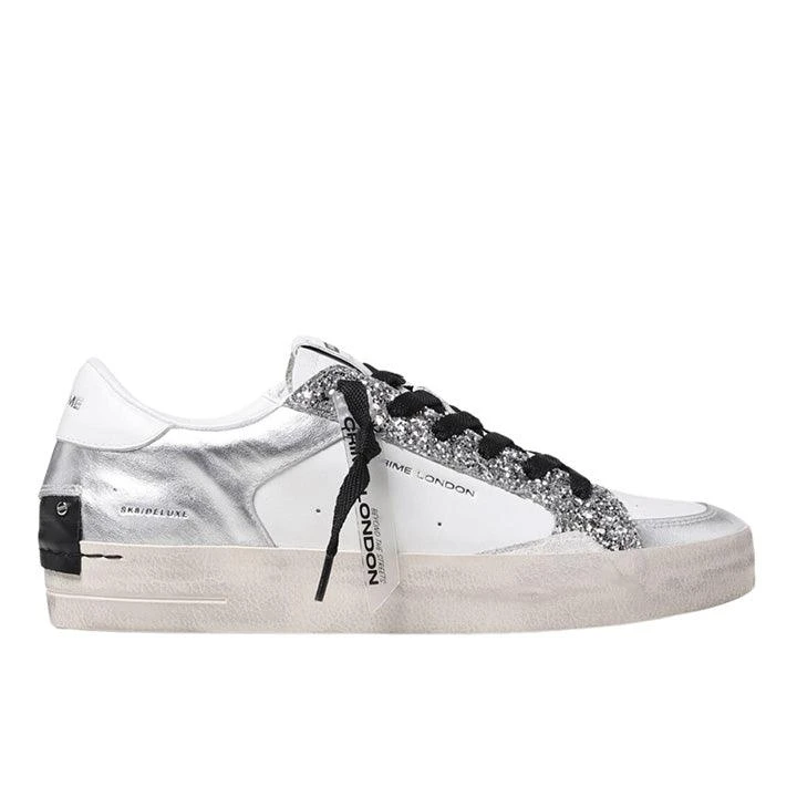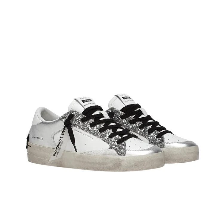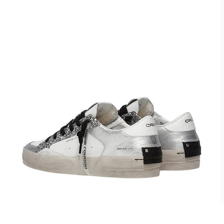 - White leather upper with laminated silver profiles, white heel, silver glitter and suede details