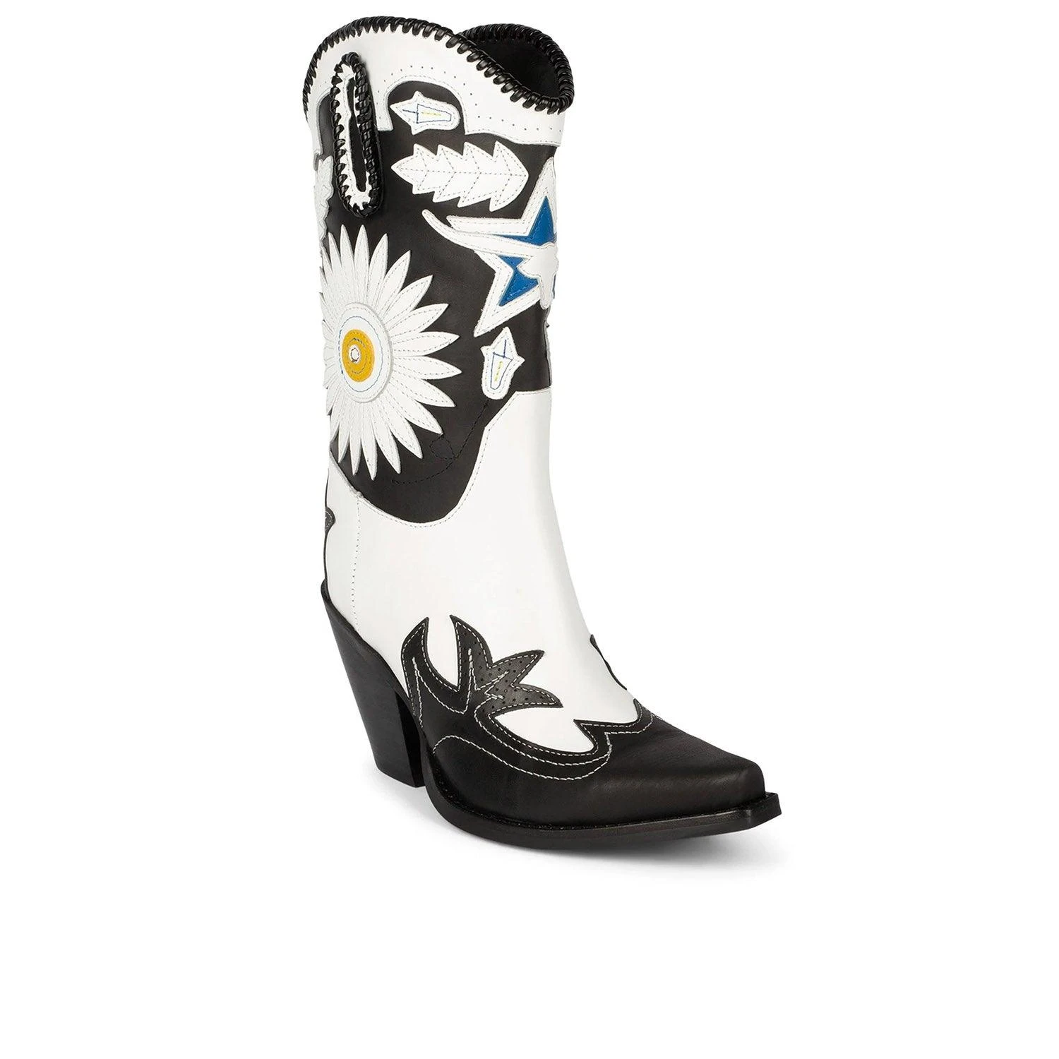 Mid-calf heeled western boot with flower and longhorn star inlay