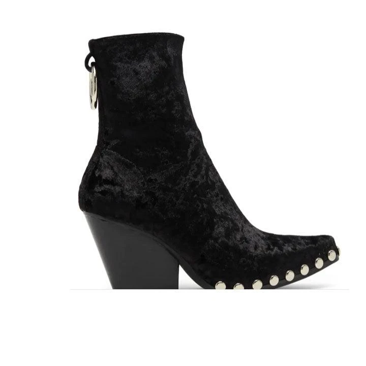 Rounded silvertone studs enhance the Western-inspired look of a faux-leather, pointy-toe boot in a slimline silhouette.
