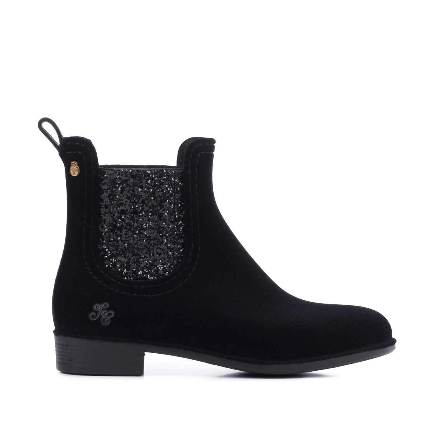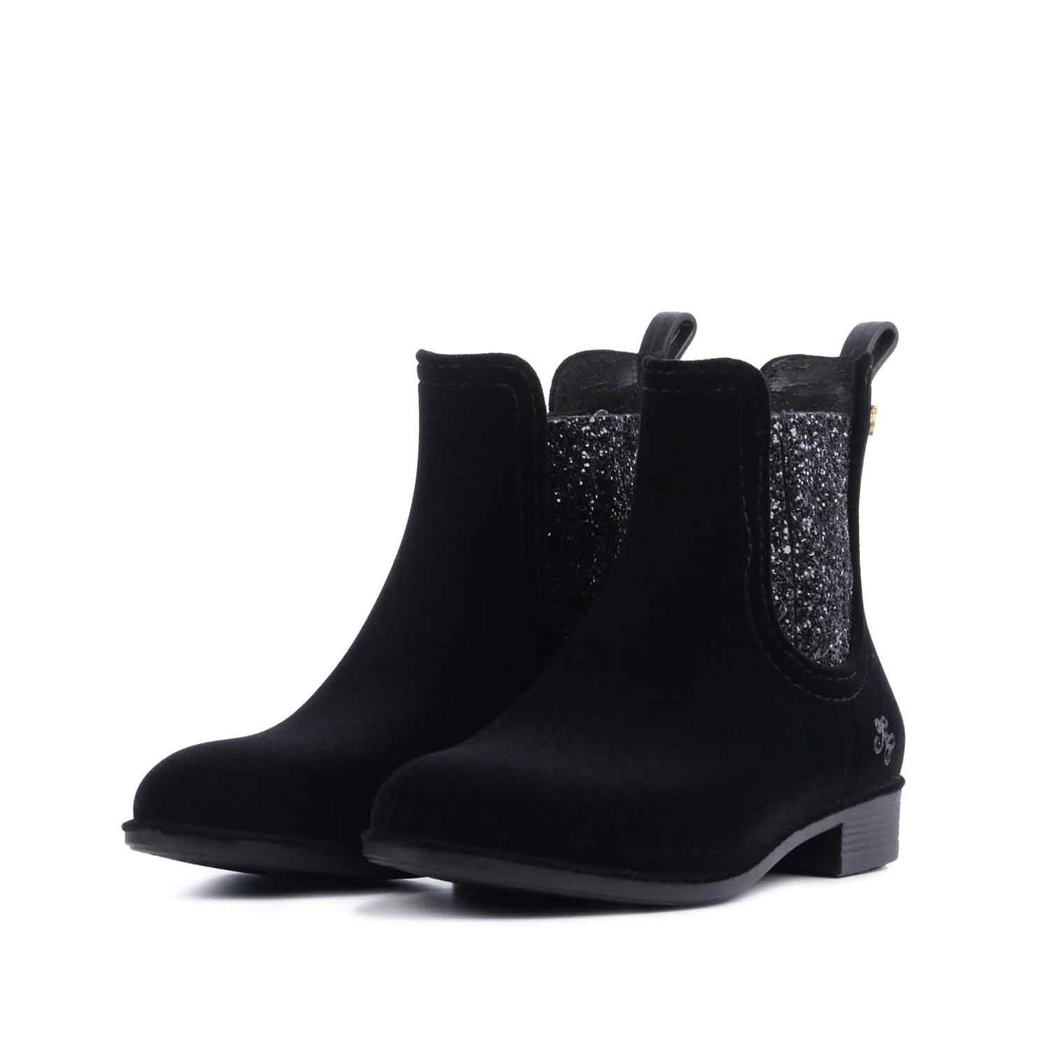 Lemon Jelly kids black suede rain boots with black glitter elastic