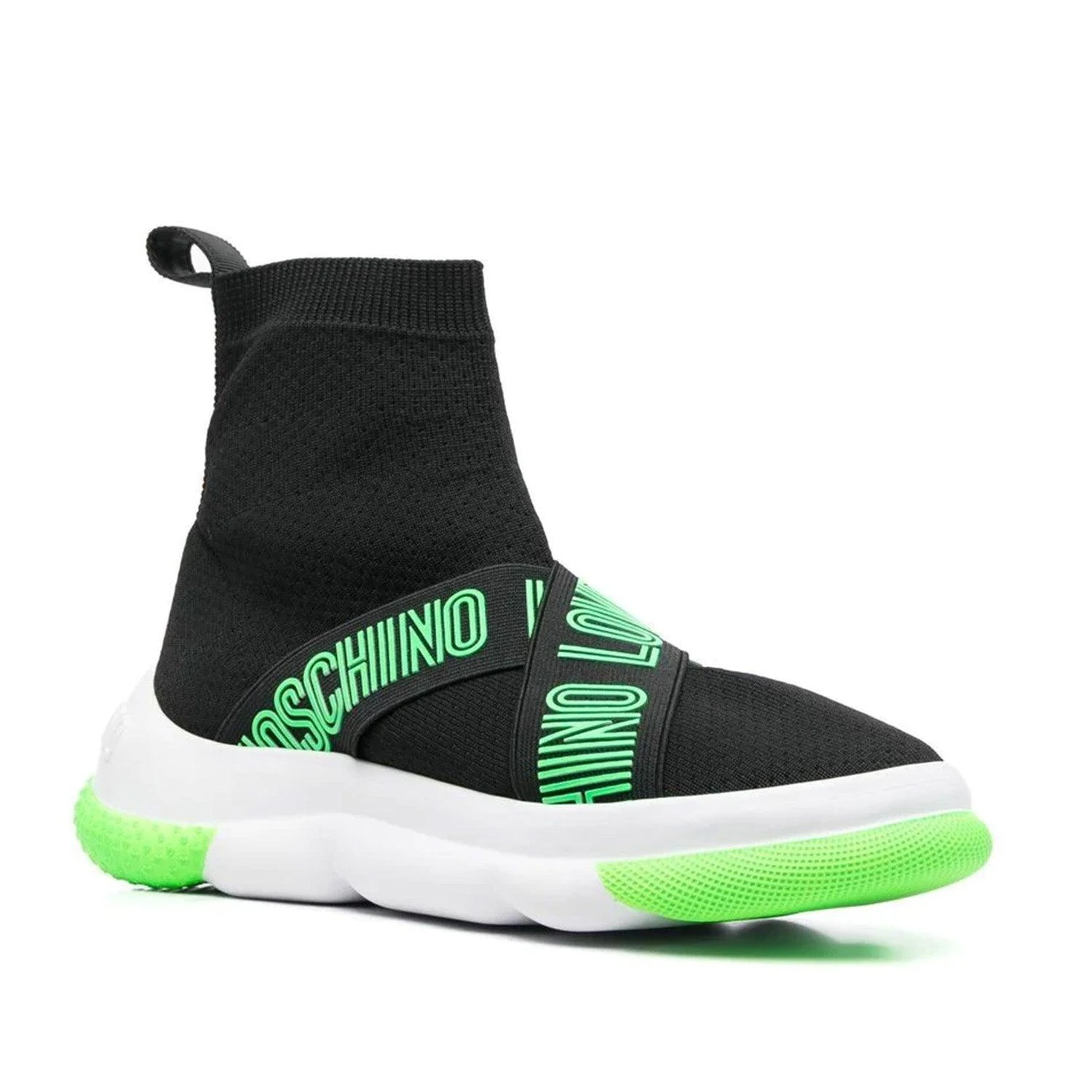 logo-strap high-top sneakers from LOVE MOSCHINO featuring black, logo-print strap, ribbed detailing, round toe, ankle-length, pull-tab at the heel, branded insole and ridged rubber sole.