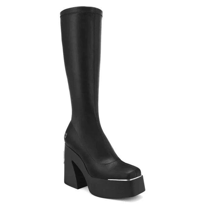 Under the knee platform square toe boot, leg hugging upper featuring Naked Wolfe “wolfe head” plaque on outside heel and silver metal toe cap feature.