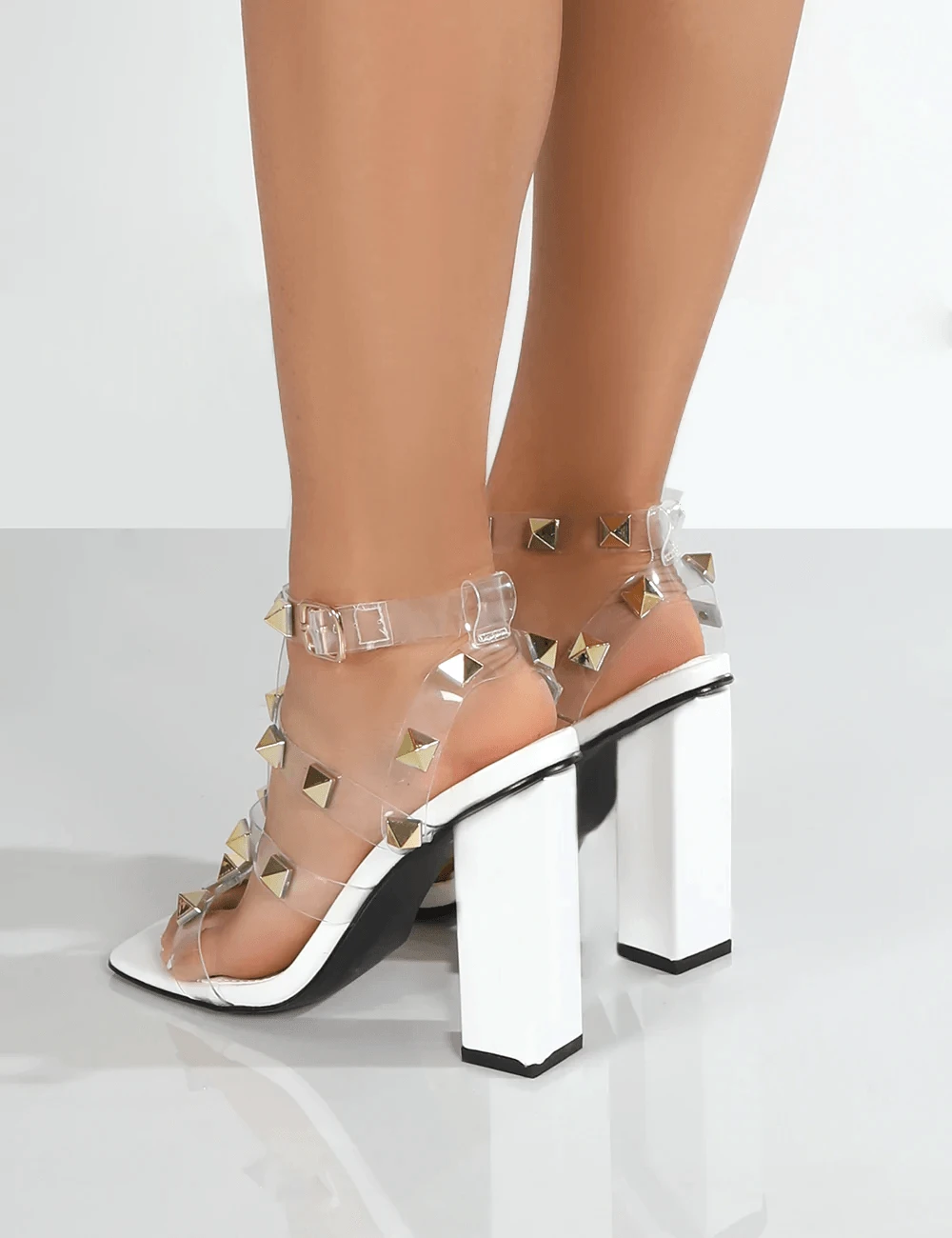 Admired features studded perspex strap detailing with a square toe block heel. Be prepared to stun in these summer essentials, match with fav outfits to add some edge to you look!
