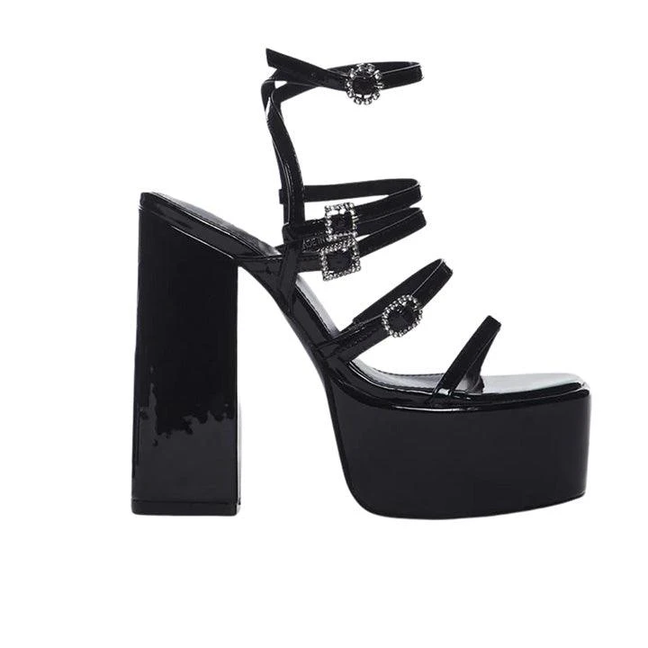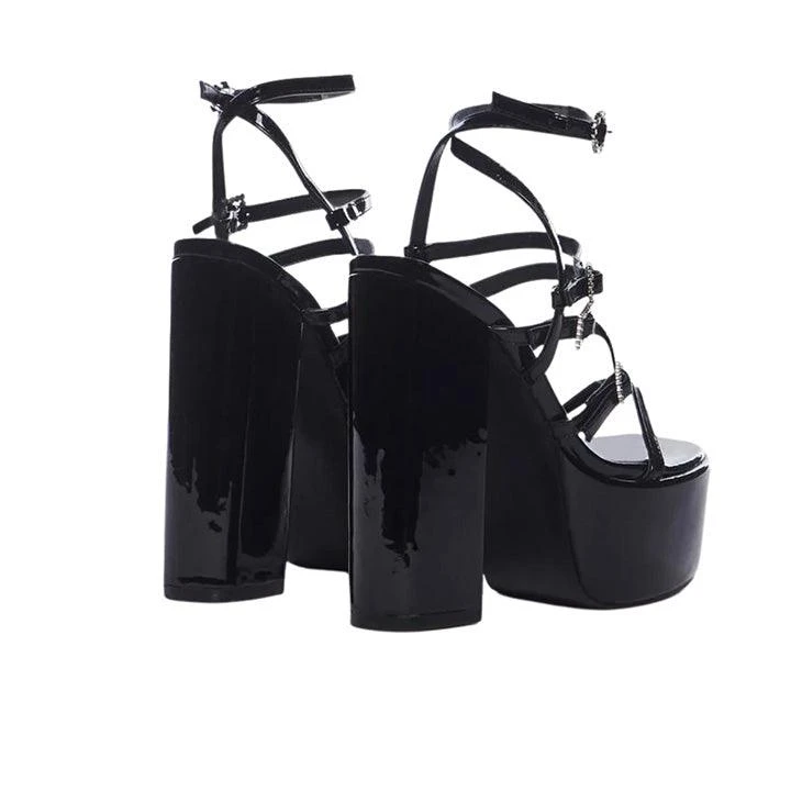 Public Desire Flawless Platform Strappy Heeled Sandals cuz I dare you to tell me otherwise. These shoes come in a patent vegan leather construction, with a platform heel, strap details, and rhinestone buckle closures.